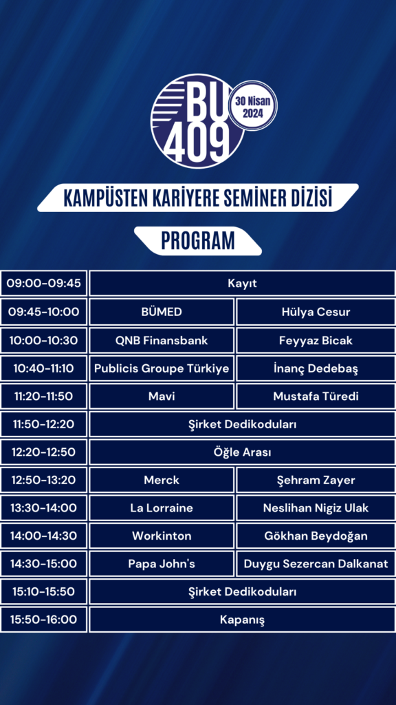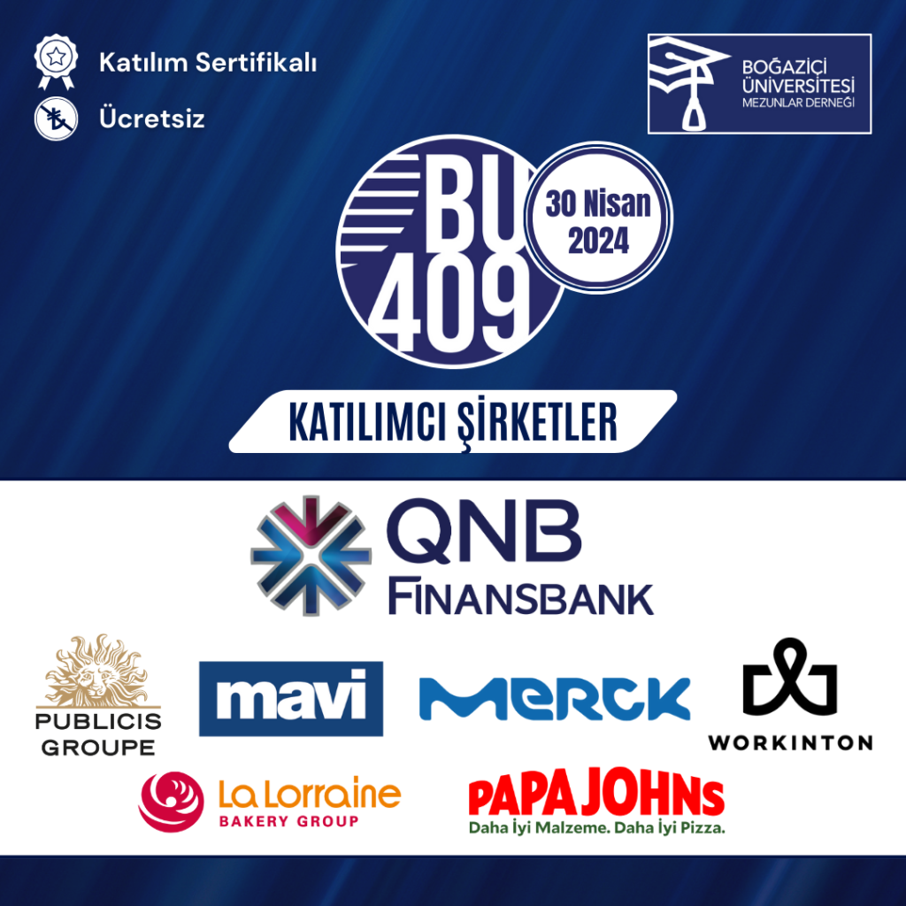Boğaziçi Üniversitesi Mezunlar Derneği olarak sizleri, kariyerinize ilham verecek bir etkinlik olan BU409 – Kampüsten Kariyere Seminer Dizisi‘ne katılmaya davet etmekten mutluluk duyuyoruz!